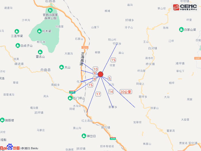 附近村镇:本次地震周边5公里内的村庄有水泉、阴山沟村、大许沟村、上何家、马葛湾、番地坪、松牙子、学房、纯子坡、石家峪,20公里内的乡镇有狮子乡、两河口乡、官亭镇、秦峪乡、化马乡、沙湾镇、竹院乡、新寨乡、池坝乡、两河口镇。