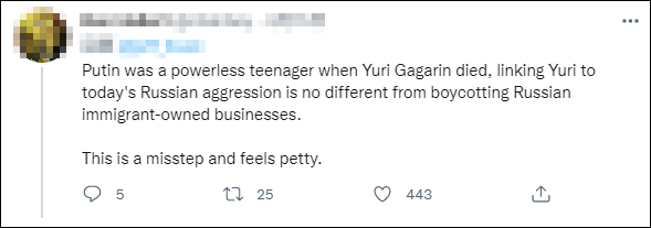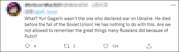 科技新闻网站“未来主义(Futurism)”评论道,“在庆祝‘人类在太空取得的成就’的同时,却抹去了第一个飞上太空的人类的名字,这太糟糕了……但这样做符合抵制所有俄罗斯事物的潮流,包括著名作曲家和食品,这样做是令人发指的(outrageous)。”
