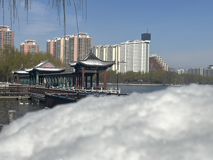 雪花轻舞,春花翩飞,不少百姓纷纷走出家门踏雪寻梅,欣赏“梅须逊雪三分白,雪却输梅一段香”的美景。除了梅花,莲花池公园西南角的山桃花、迎春花也竞相开放,绽放的春花在雪花映衬分外俏皮可爱。