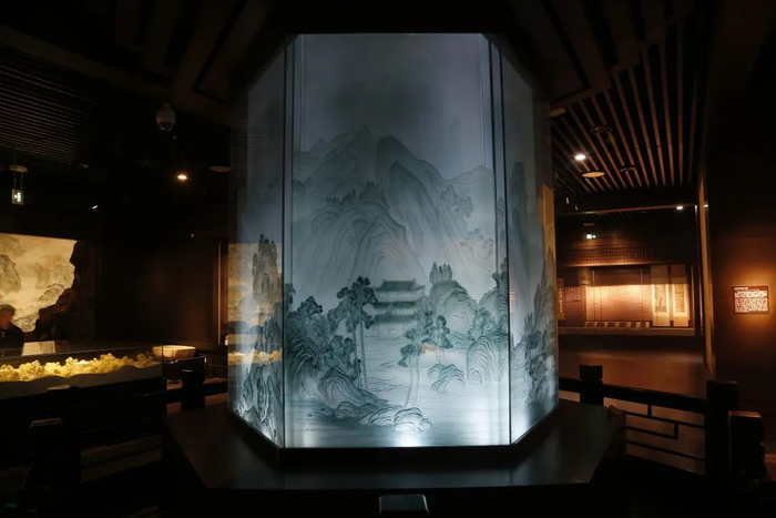 中国园林博物馆古代园林厅中,有一座三层玻璃制作而成的立体画层雕,描绘的是王维在不惑之年,半官半隐,在京城的南蓝田山麓的辋川别业中修身养心的生活。