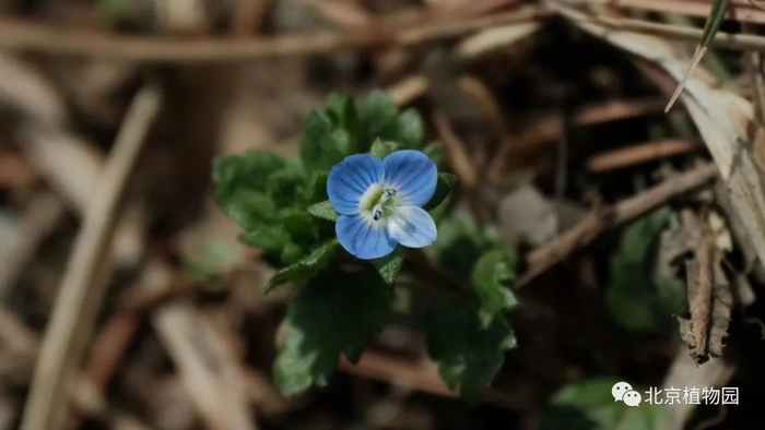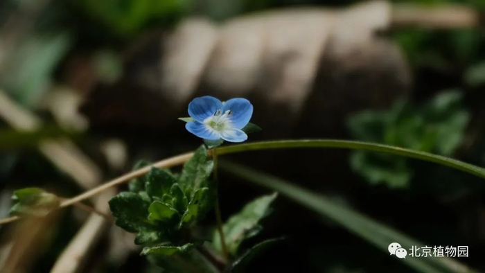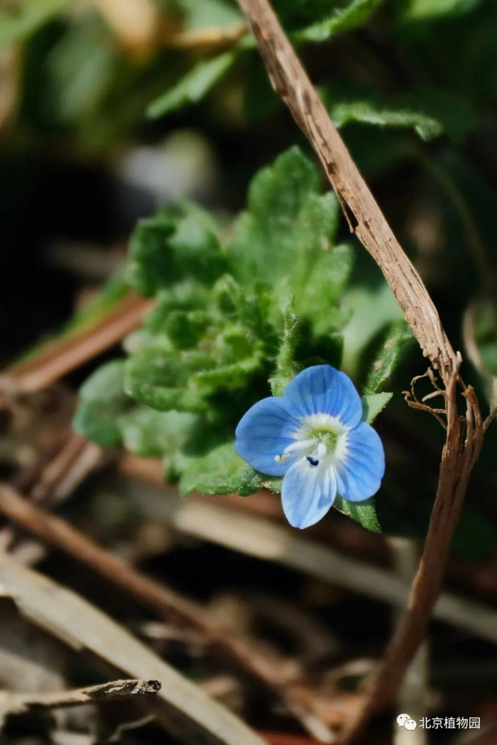 当我们放慢脚步低头凝望时,会在斑驳的黄色草地中发现一些一片青翠的绿,其中点缀着一些精致的小花,花瓣上有着深色线条状花纹,整体呈现出淡雅的蓝紫色,如点点繁星,使大地点缀上天空的色彩。这种蓝色的小花名叫阿拉伯婆婆纳Veronica persica,原产于亚洲西部和欧洲。
