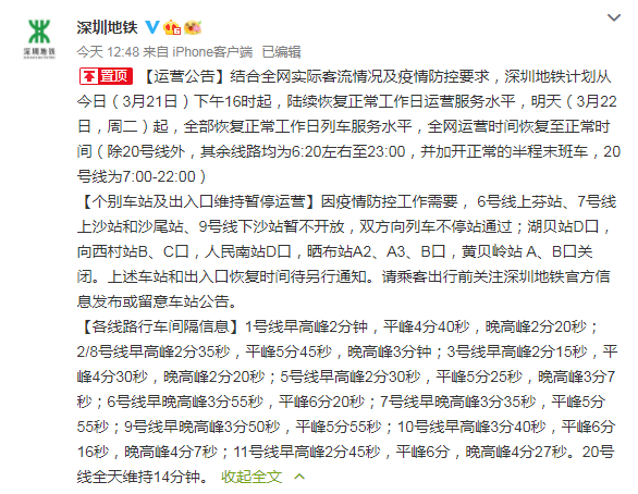同时,深圳地铁计划从今日下午 16 时起, 结合全网实际客流情况及疫情防控要求,陆续恢复正常工作日运营服务水平。3 月 22 日起,全部恢复正常工作日列车服务水平,全网运营时间恢复至正常时间。除 20 号线外,其余线路均为 6:20 左右至 23:00,并加开正常的半程末班车,20 号线为 7:00-22:00。