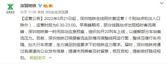 3 月 21 日,深圳地铁全线网也同时恢复运营(个别站点和出入口除外),运营时段为 6:30-23:00。周一开工早高峰期间,由于恢复上班市民比较多,地铁部分线路站点出现短时客流高峰。针对这一情况,深圳地铁第一时间启动应急预案,组织加开 20 班列车上线,以缓解部分车站客流压力。