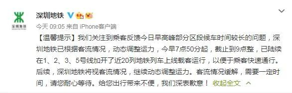 有部分市民反映,深圳地铁部分站点出现人口集聚。不少网友在深圳地铁微博留言建议加开班次。深圳地铁连发三条微博给予响应。