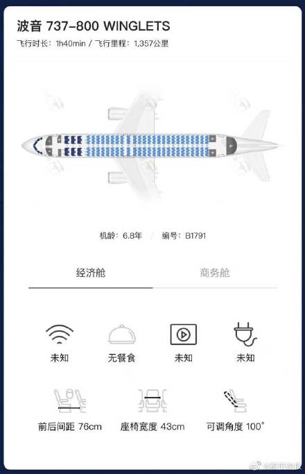 东航MU5735航班由B-1791,波音737-800(NG)执行,该机注册号为B1791,机龄6.8年,2015年6月22日交付东航云南分公司,客舱布局为J12Y150。