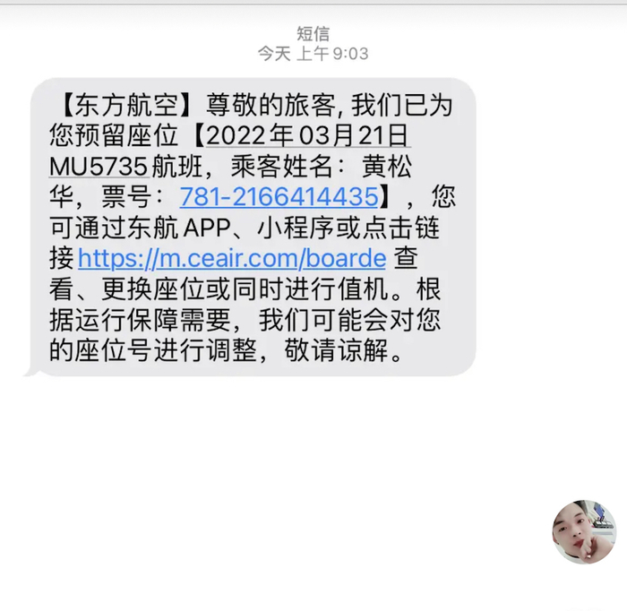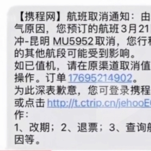 有一位乘客黄松华通过社交媒体表示,其预订的是3月21日从腾冲到昆明,再从昆明到广州的2个航班。然而,就在出发前一天,黄松华接到了预订平台给他发来的服务信息,告知他由于天气原因,其预订的3月21日腾冲-昆明的MU5952航班取消。由于第一个航班的取消,也使得黄松华无法搭乘第二个航班,即之后发生坠毁事件的MU5735航班。
