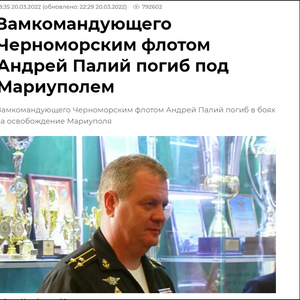 综合俄新社、生意人报、卫星通讯社等俄媒报道,俄罗斯黑海舰队主管军事政治工作的副指挥员(Замкомандующего)、海军上校安德烈·尼古拉耶维奇·帕利(Андрей Николаевич Палий)在乌克兰马里乌波尔附近阵亡。