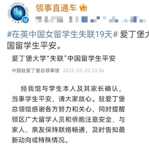 “经我馆与学生本人及其家长确认,当事学生平安,请大家放心。驻爱丁堡总领馆感谢各方努力和关心,同时提醒领区广大留学人员和侨胞注意安全,与家人、亲友保持联络畅通,及时告知最新动向或特殊情况。”随着3月20日23:34, 中国驻爱丁堡总领事馆社交平台发布“爱丁堡大学‘失联’中国留学生平安”这一推文,广大网友的心才真正放下,在英失联19天女留学生已找到这一圆满结局让人欣慰。黄同学本人的朋友圈显示,闭关写博士研究计划,手机关机很久没看到信息。