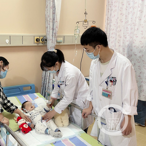 月月满月后,腹胀、吐奶的状况日渐加重,精神也越来越差,月月妈妈抱着最后的希望带孩子来到重庆医科大学附属儿童医院普外创伤外科。经过专家仔细的专科检查,很快确诊了月月的疾病,她患上了一种罕见、复杂的“泄殖腔畸形”,俗称“一穴肛”。