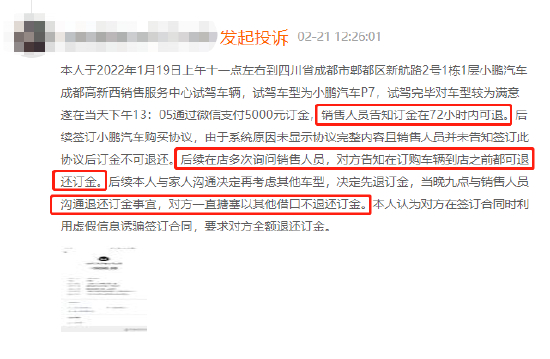 2月黑猫投诉平台收到了大量针对小鹏汽车的投诉单,多名消费者表示自己在选购汽车的过程中遇到了退定金困难的问题。其中有销售人员未告知72小时犹豫期的规则,导致超时无法退定金;还有销售人员承诺车到店前定金都可以退,实际执行时却以各种理由搪塞不退定金等多种情况。截至2月底,小鹏汽车累计有效投诉400余单,回复率仅为25.63%。