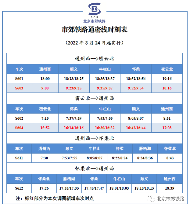 为进一步提高运营服务质量,满足乘客多样化出行需求,自3月24日起,通密线将增开通州西站至密云北站S603次列车和密云北站至通州西站S604次列车。其中,S603次列车上午9:00从通州西站始发,10:16抵达密云北站;S604次列车下午15:52由密云北站始发,17:08抵达通州西站(具体列车时刻表详见附表),两趟列车均停靠沿途的顺义站、牛栏山站和怀柔站,并办理上下客业务。