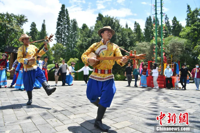 2021年6月,云南昆明,云南民族村的普米族青年弹奏传统乐器与游客欢度传统的普米族情人节。中新社记者 刘冉阳 摄