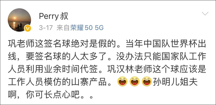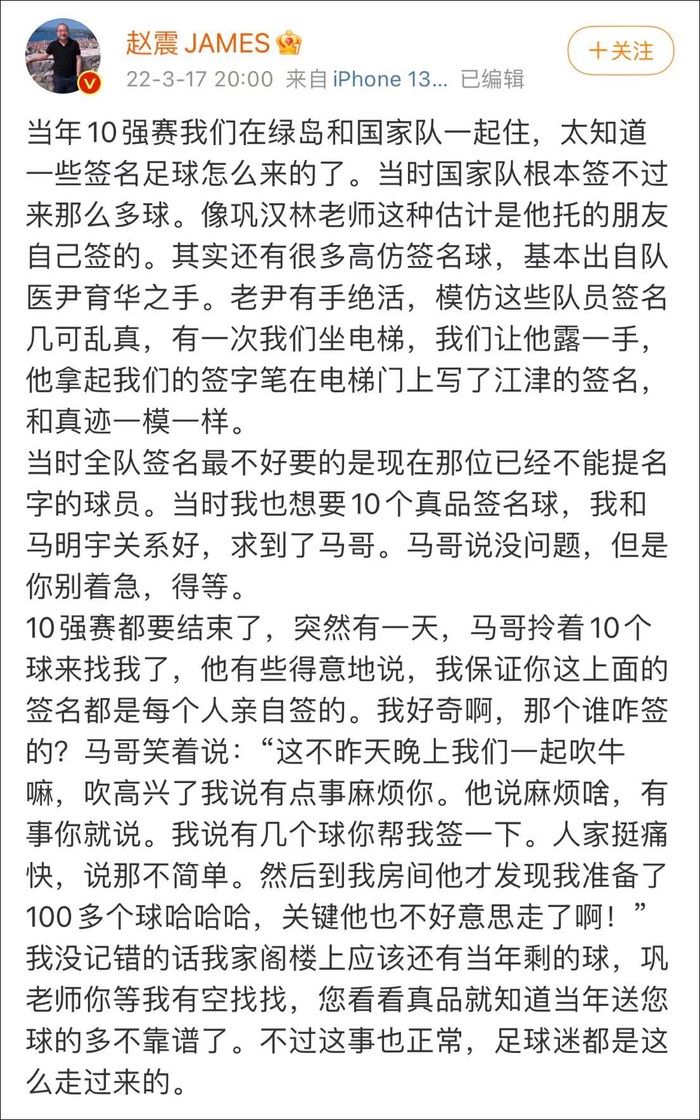 体育博主@赵震JAMES 也曾给出过类似说法,“太知道一些签名足球怎么来的了。当时国家队根本签不过来那么多球。像巩汉林老师这种估计是他托的朋友自己签的。”