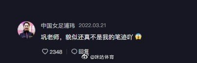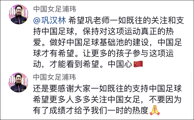 不过,目前,浦玮已经将此前给巩汉林的评论删除了,并重新写道,“希望巩老师一如既往地关注和支持中国足球,保持对这项运动真正的热爱”,她还喊话网友们能够多多关注女足,不要因为有了成绩才给予女足一时的热度。
