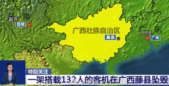 民航局相关人员通报,东航MU5735航班于3月21日13时16分从昆明起飞, 14时17分保持巡航高度8900米进入广州管制区。14:20管制员发现飞机高度急剧下降,随即多次呼叫机组,但未收到任何回复,14:23飞机雷达信号消失,后经核实,飞机在广西壮族自治区梧州市藤县境内坠毁。