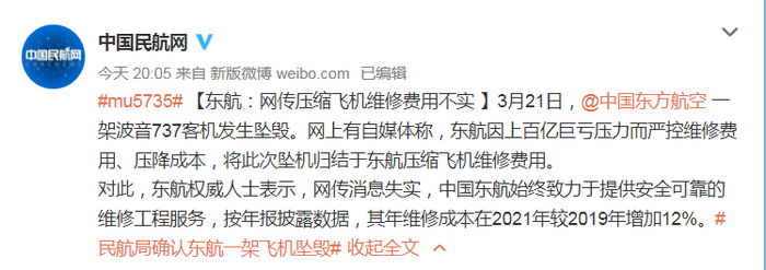 网上有自媒体称,东航因上百亿巨亏压力而严控维修费用、压降成本,将此次坠机归结于东航压缩飞机维修费用。