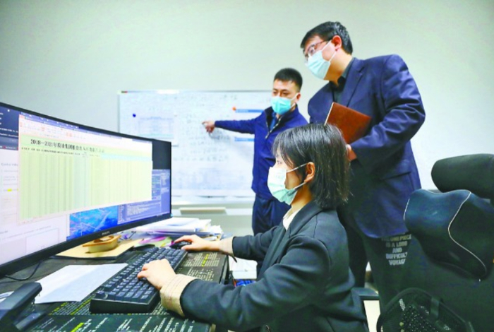 辽宁省沈阳市纪委监委对沈阳粮油集团粮食出入库数据开展数据分析,构建粮食购销领域专项监督模型。图为该市纪委监委大数据监督室工作人员围绕数据进行建模。袁国航 摄