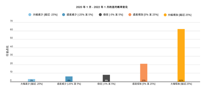 在过去的两年里,由于不确定性,全球近三分之二 (62%) 行业的违约概率有所增加,并保持在较高水平。奥密克戎等新冠病毒变异株可能会成为一种常态,这使得人们更加担忧疫情及其对经济和信用的影响。此外,供应链中断和消费者支出放缓为正在复苏的经济增添了更多不平衡。