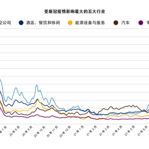在 2020 年 1 月 2 日至 2022 年 1 月 15 日期间,受新冠疫情影响最大的五个行业包括:航空公司;汽车;能源设备与服务;酒店、餐饮和休闲;以及专营零售。因为评估的时间线延长到了今年年初,去年10月分析中提及的“汽车零部件”和“多元化零售”行业已不在此榜单之中。如图 1 所示,这五个行业的 PDMS 中位数均在 2020 年 4 月见顶,但到 2021 年 1 月出现大幅下降。