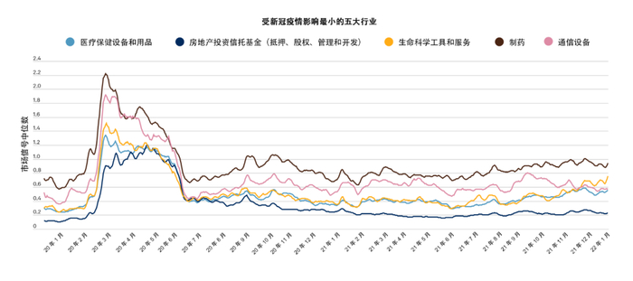 受新冠疫情影响最小的五个行业包括:通信设备、医疗保健设备;用品、生命科学工具和服务;制药以及房地产投资信托基金。在这次评估中,上次分析中提及的“保险”、“半导体和半导体设备”以及“家居用品”行业已不在此榜单之中。如图2 所示,这些行业的违约概率中位数与受影响最大的行业的趋势相似,但起点和终点水平较低。