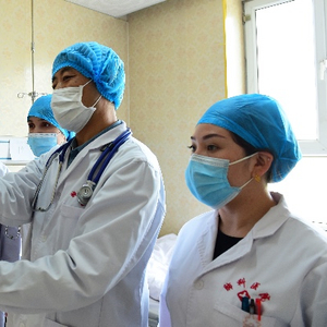 第十批山东省援助喀什地区肺科医院工作队成员吴海良(右二)与当地医务工作者讨论患者病情(2021年4月17日摄)。新华社