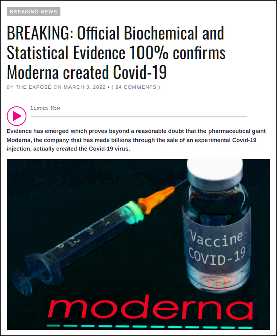 《每日邮报》的报道发布8天后,3月3日,英国反疫苗网站The Expose在一篇文章中援引了《每日邮报》的报道,标题是”突发新闻:生化证据100%证实Moderna制造了新冠病毒“。