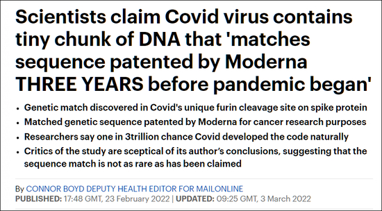 《每日邮报》提到了文中的主要论点:“在Covid的furin酶切位点发现了刺突蛋白的基因匹配;这段匹配的基因序列与莫德纳公司一项为癌症研究申请的专利一致;研究人员表示,新冠病毒自然合成有关的序列只有三万亿分之一的几率”。