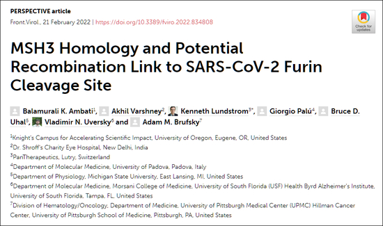 这一说法的核心证据是一篇于2月21日发表在期刊《病毒学前沿》(Frontiers in Virology)的论文《MSH3 Homology and Potential Recombination Link to SARS-CoV-2 Furin Cleavage Site》。