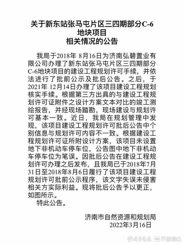 齐鲁晚报·齐鲁壹点记者在网站查询到该情况公告,原文称济南市自然资源和规划局于2018年 8月16日,为济南弘碧置业有限公司办理了新东站张马屯片区三四期部分C-6地块项目的建设工程规划许可手续,并进行了批前公示及批后公告。近日发现,批后公告中个别信息与规划许可内容不一致。根据建设工程规划许可证所附设计方案,该项目未设置地下非机动车停车位,公告图中为笔误。此外,公告还写到:因批后公告在建设工程规划许可办理之后发布,且济南市自然资源和规划局已于2018年7月31日至2018年8月6日履行了该项目建设工程规划许可批前公示程序,该文字失误未侵害相关方实际利益。该公告附的修正后的公示图中,只显示了非机动车停车数量为1589,未区分地面和地下。此外,商业机动车停车数量为65辆,均在地下。