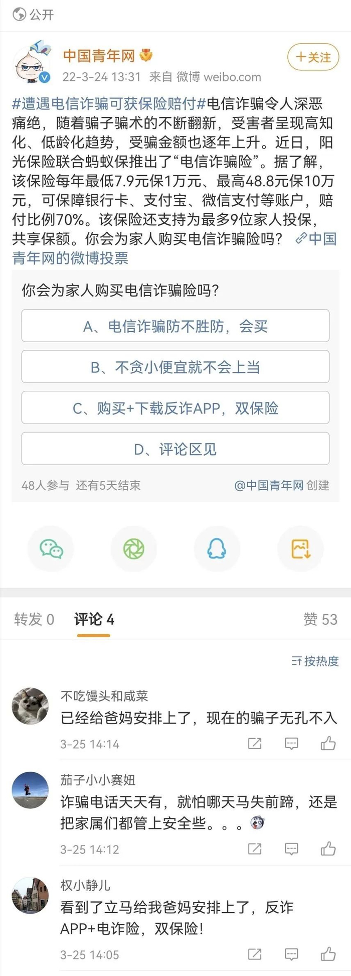 所以,在“电诈险”推出后的报道和网络话题讨论中,不少购买者是年轻用户,或者会替父母购买电诈险。“但也不能以为买了这样的保险就万事大吉了,甚至放松了防范电信诈骗的这根弦,事前预防还是很重要。”