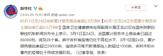 会上,国家卫生健康委疾控局副局长、一级巡视员雷正龙介绍,3月1日至24日,全国累计报告本土感染者已超过56000例,波及28个省。其中吉林省疫情仍处于高位水平,3月1日至24日,累计报告感染者超过29000例,连续多日每天新增感染人数超过1000例,吉林市和长春市的疫情处于持续发展阶段。上海市、河北省、福建省、辽宁省疫情近日快速增长,疫情发生地的社区传播风险持续存在。山东省青岛、威海、淄博,广东省深圳、东莞等地疫情已得到初步控制。北京市、重庆市、浙江省等地疫情形势趋于平稳。