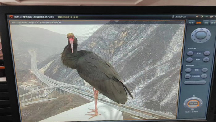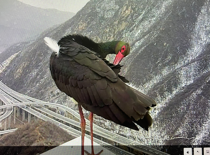 镜头前,一只红脚黑羽的大鸟侧立着,脑袋转向左边,又长又尖的喙几乎戳到了镜头上。它的背后是积雪犹存的连绵群山。“这是防火监控拍下的照片,负责森林防火的同事发现后,立马转给我们辨认。”松山国家级自然保护区管理处监测保护科科长范雅倩说,她们惊喜地发现,这是国家一级保护动物——黑鹳。