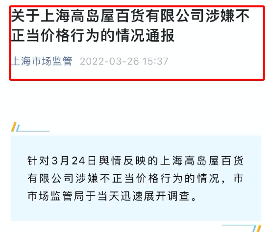 据上海市场监管局消息,针对3月24日舆情反映的上海高岛屋百货有限公司涉嫌不正当价格行为的情况,市市场监管局于当天迅速展开调查,并于今天下午发布通报: