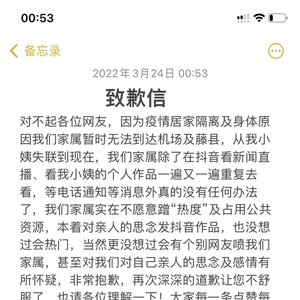 3月25日凌晨,我发了一个致歉信,之后整夜都没有睡着。我现在都不敢发抖音了,害怕被喷。我把家里人拉黑了,特别是直系亲属,因为不想让他们看到这些。本来他们就已经很难过了,看到这些肯定会更加难过。