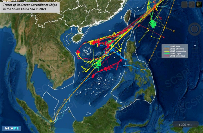 2021年美军五艘海洋监视船活动轨迹图。图源:SCSPI