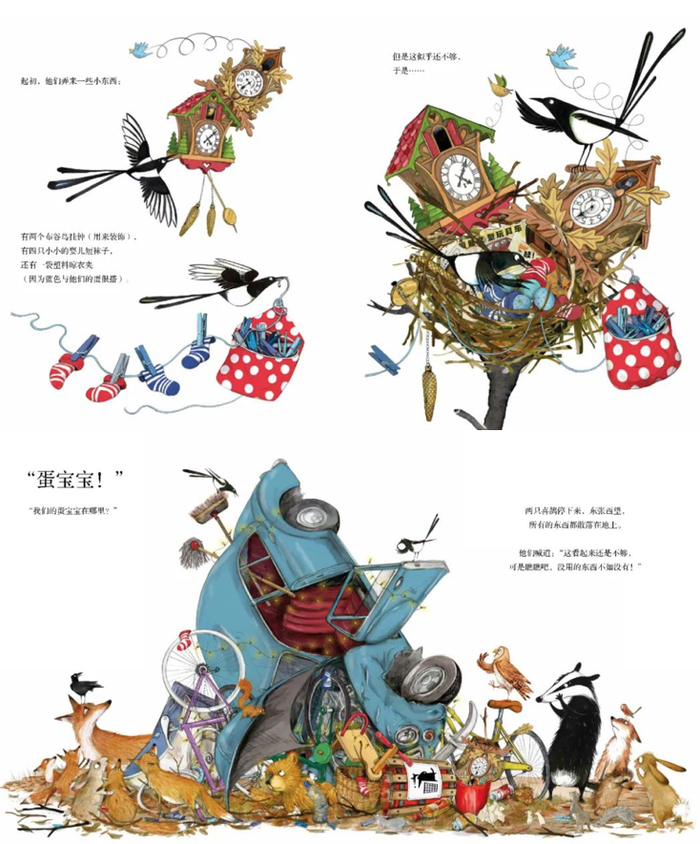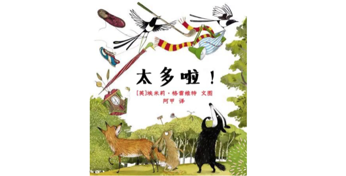 埃米莉·格雷维特创作的绘本总是以动物为主角,故事跌宕起伏,并富有哲理。这本《太多啦!》阿甲老师评论为“苏斯博士式的断舍离”,它讲的是喜鹊夫妇阿拾和梅梅即将迎来宝宝,于是四处搜寻给宝宝的东西,比如自行车、晾衣夹、咕咕挂钟、婴儿车、灯炮、泰迪熊等,它们看起来的确很有用,可是当全都被搜罗过来后,不仅令鸟巢拥挤不堪,很快就因为太沉而压垮了树枝,四个鸟蛋也不如去向。喜鹊夫妇忽然认识到,这是因为一切都太多了……这本书也是给育儿中爱过度消费的父母的警醒。