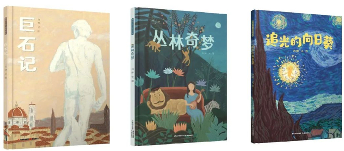 在最新出版的这三本书中,《巨石记》故事性最强,《丛林奇梦》最有幻想色彩,《追光的向日葵》最具诗意。《巨石记》讲的是一块石头如何历经坎坷变成了米开朗琪罗的《大卫》雕像。《丛林奇梦》的主角是法国后印象派画家亨利·卢梭,他就像个造梦师,在丛林里变幻着身形,探索不为人知的秘密。书里巧妙地融入了卢梭最有名的两幅作品:《梦》和《沉睡的吉普赛人》。《追光的向日葵》以梵高的向日葵为创作元素,表达了刘皞对梵高的理解与喜爱。