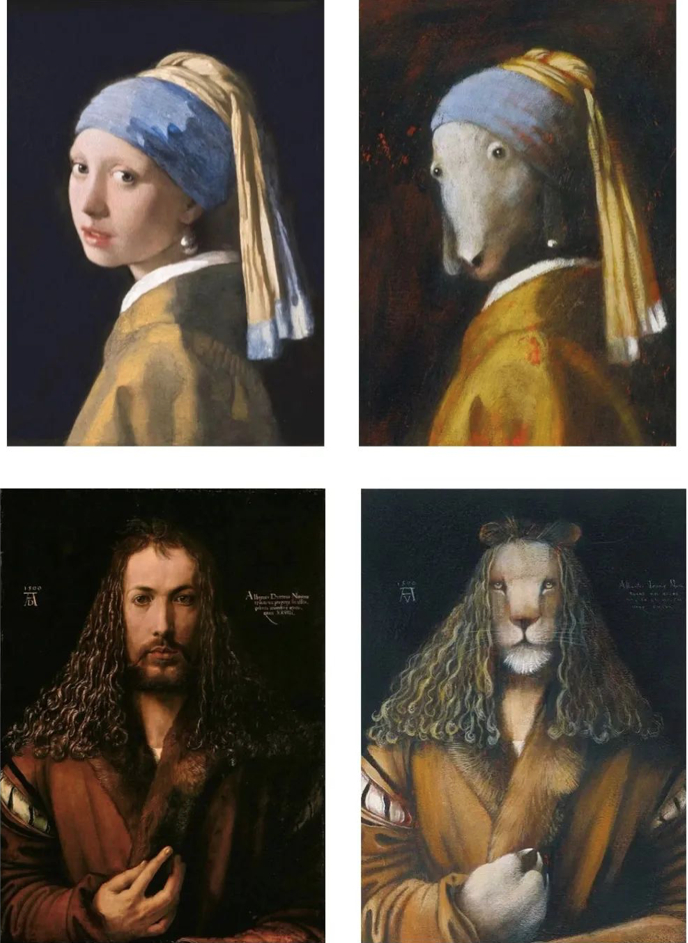 这便是这本书的创意。薛蓝·约纳科维奇(Svjetlan Junaković)从欧洲15-19世纪的肖像名作中精心挑选了多幅作品,在反复琢磨哪些动物的形象(尤其是眼神)和原作最为契合后,用它们替换了名画中的肖像,而且尽可能地还原了原作中的材质、色彩、结构和氛围,初读时几乎可以“以假乱真”。