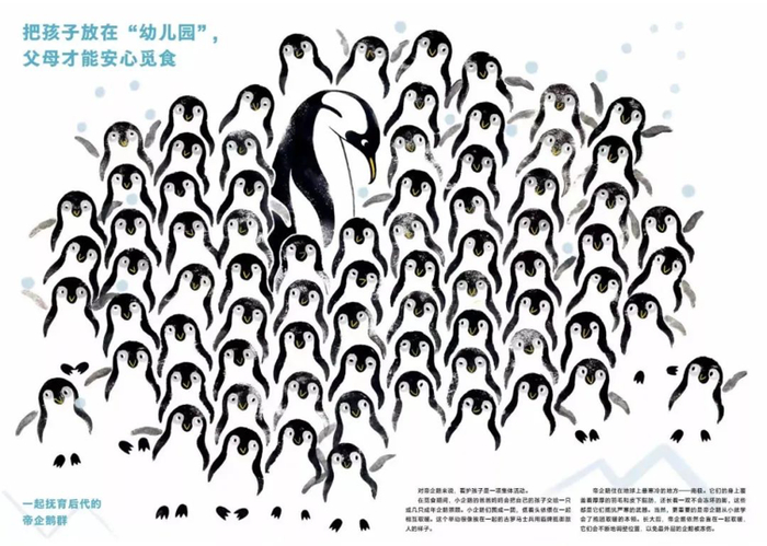 为了展现群居的气势,这本书采用的是8开的细长开本,每一页文字内容很少,把大量的空间留给了插画。