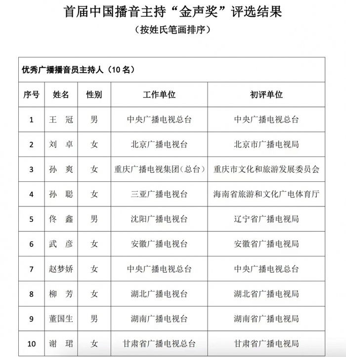 3月28日晚,国家广播电视总局办公厅正式发布了首届中国播音主持“金声奖”评选的公示结果。按照此前公布的评选规则,首届“金声奖”分别选出了优秀广播播音员主持人和优秀电视播音员主持人各10名。多位观众、网友耳熟能详的名嘴名列其中:已经主持《非诚勿扰》超过10年的重庆崽儿孟非、一句“北大还行”火遍全网的撒贝宁,以及一向以稳重著称的鲁健等……