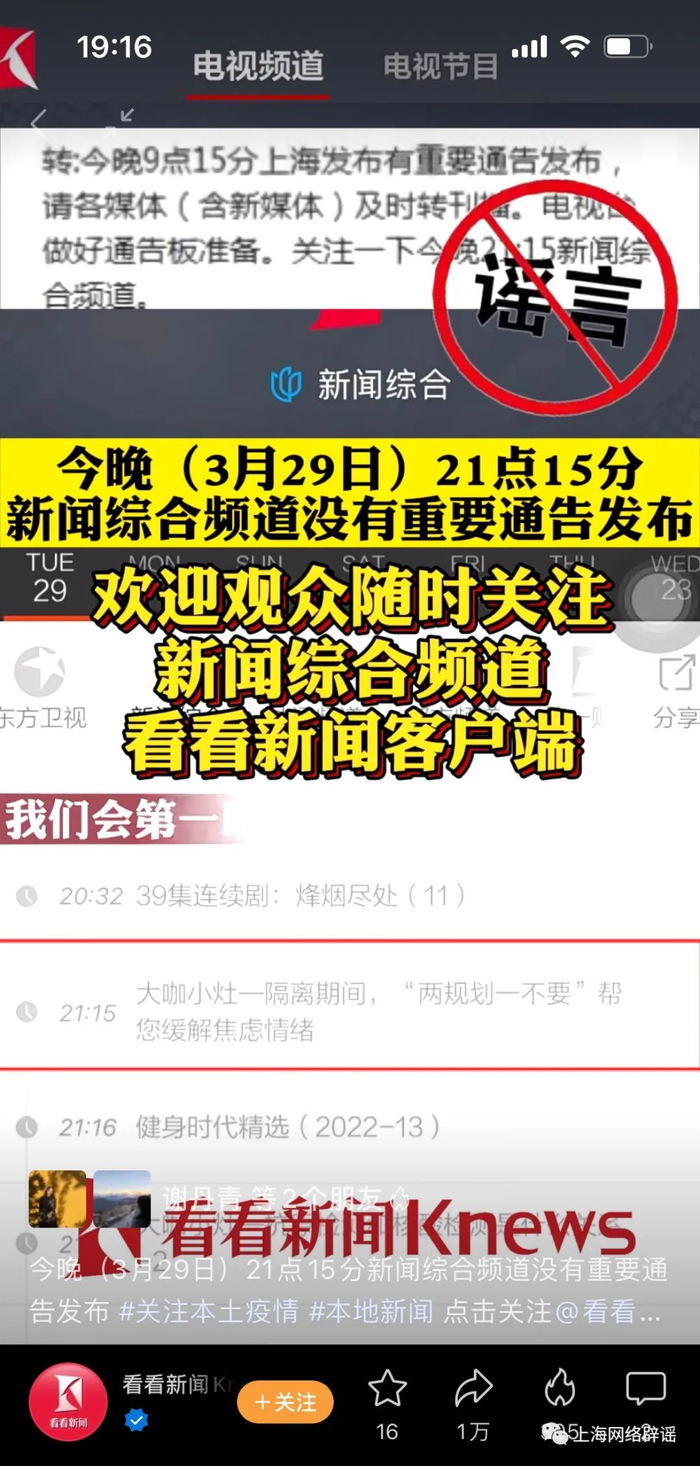 3月29日晚间,上海电视台新闻综合频道也通过官方微信视频号“看看新闻”辟谣,表示今晚(3月29日)21点15分,新闻综合频道没有重要通告发布;根据当天的节目安排,21:15的节目是《大咖小灶——隔离期间,“两规划一不要”帮您缓解焦虑情绪》。