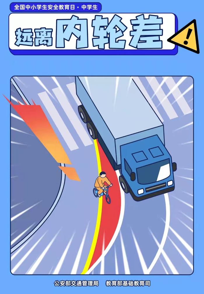 7.警惕汽车盲区和内轮差,不要靠近汽车在行驶和倒车时的盲区,不要蹲在车前玩耍等,在家门口、小区内也不能放松警惕。