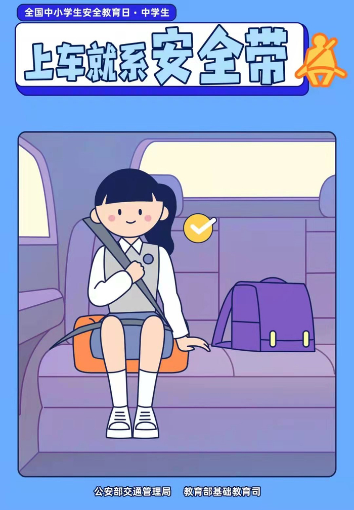 6.坐轿车要坐在后排座位,并且系好安全带,年龄较小的孩子要配套适宜的安全座椅。