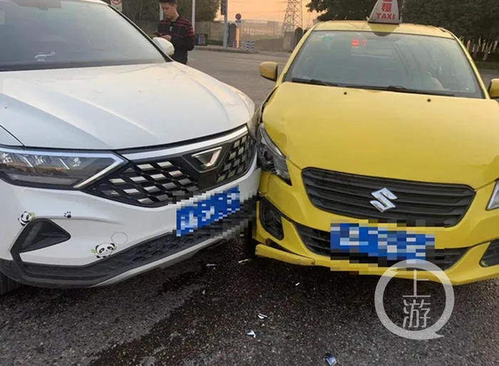 近日,渝北区空港东路与观月南路发生了一起两车相撞的交通事故。一辆白色小轿车和一辆出租车停在路口,两车不同程度受损。所幸两车驾驶员都系了安全带,事故并未造成人员受伤。