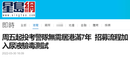 [环球网报道]据香港“星岛网”消息,香港警务处今天(30日)宣布,由4月1日起调整警员、见习督察及辅警警员的居港年期入职要求,并在招募的遴选程序中加入尿液验毒测试。从4月1日开始,警员、见习督察及辅警警员入职要求中“在港居住7年或以上”的居港年期规定将会取消,申请人只须符合“香港特别行政区永久性居民”的要求便可投考。