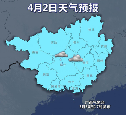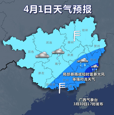 4月1日,桂东南和沿海部分地区有中到大雨,局部暴雨或短时雷暴大风等强对流天气,我区其它地区阴天有小雨。