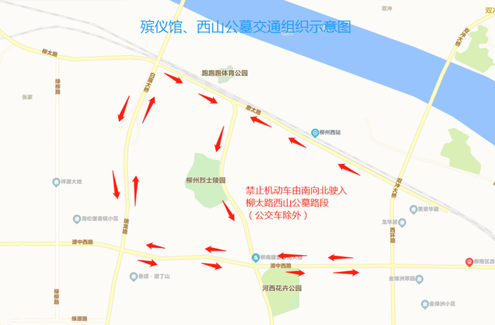 4月5日、6日、9日、10日,每日7时30分至17时30分,柳太路从与磨太路相交路口至与潭中西路相交路口路段,实行机动车由北往南单向通行(公交车除外);磨太路从双冲大桥桥底至与柳太路相交路口,实行机动车由东向西单向通行。从市区前往西山公墓的机动车辆,可沿潭中西路、瑞龙路、白露大桥匝道、柳太路绕行至西山公墓;也可通过西环路、双冲大桥匝道、磨太路前往市殡仪馆或西山公墓。