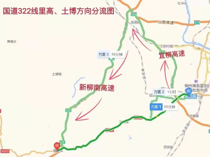 1.国道322线:拉堡至里高、土博路段堵塞的,往里高、土博方向的车辆可通过宜柳、新柳南高速公路绕行;