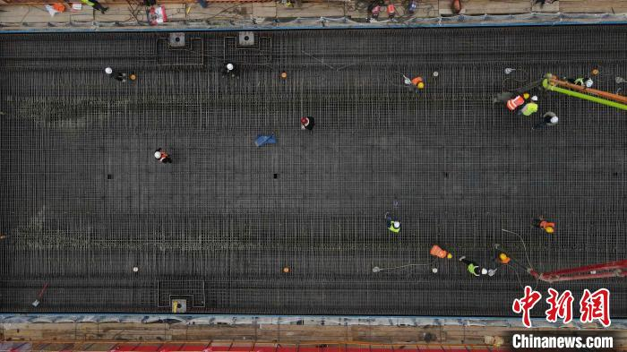 图为现场施工人员正在进行箱梁浇筑作业。 杨丙峰 摄
