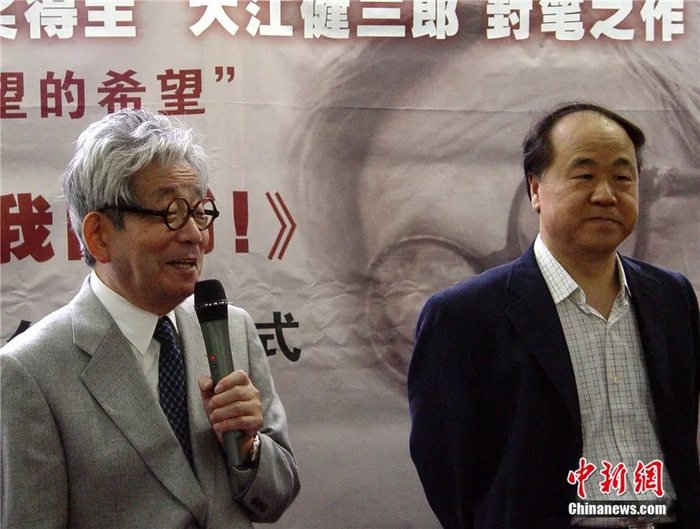 2006年,诺贝尔文学奖得主、日本作家大江健三郎第五次访华,在北京签售新作《别了,我的书》。图为大江健三郎与中国作家莫言在签售现场。中新社记者 应妮 摄